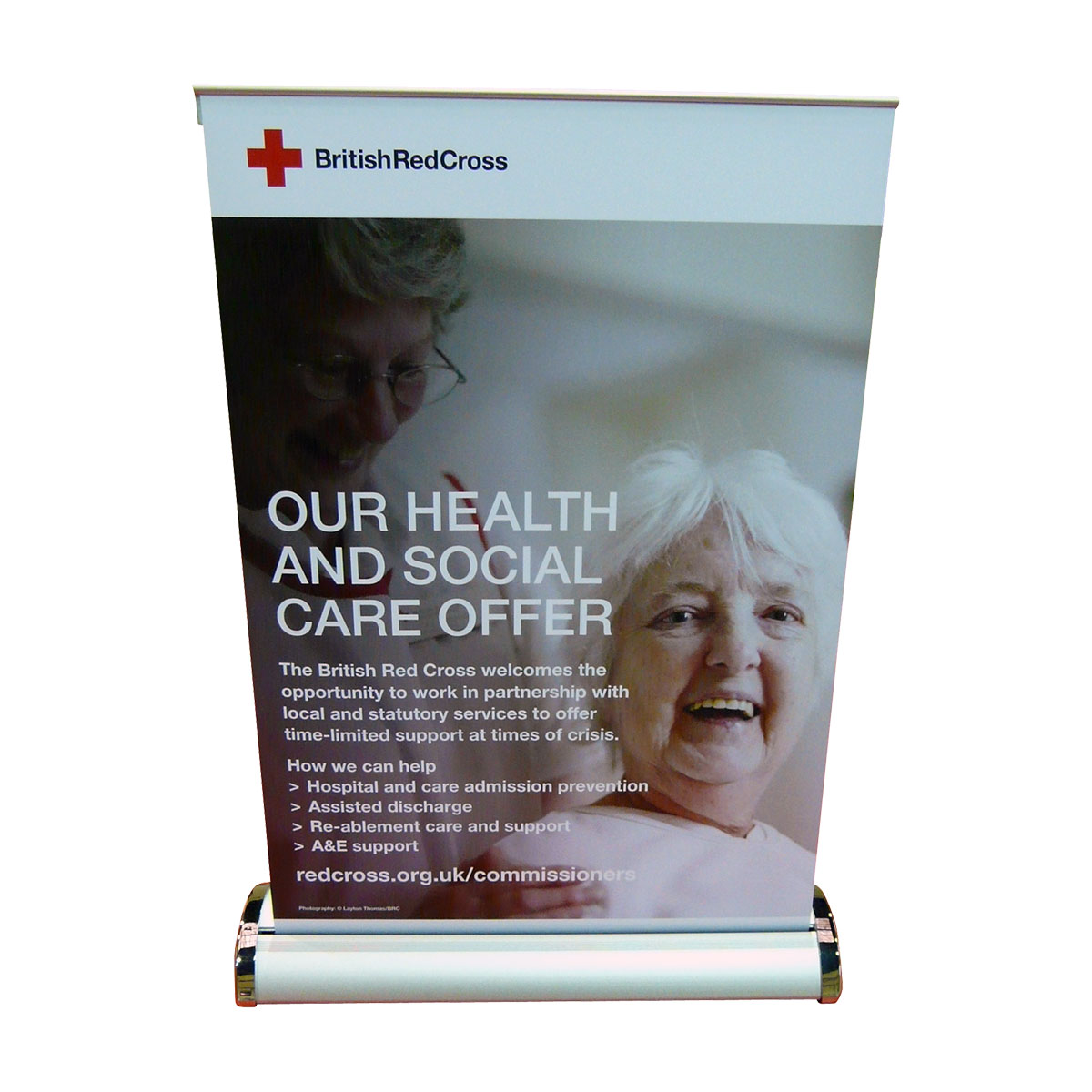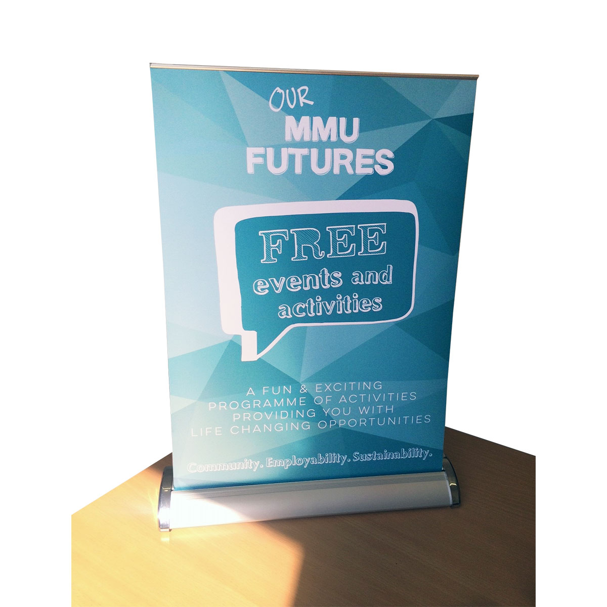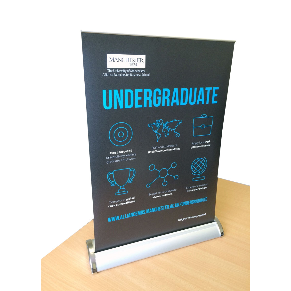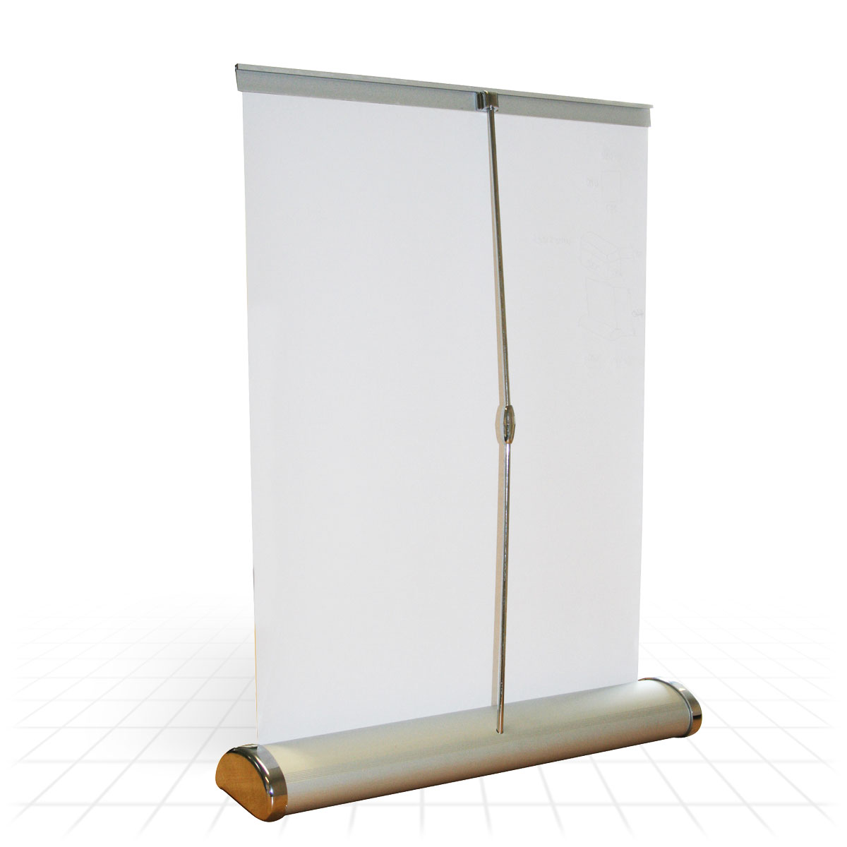 Ideal as a mini display for counters and tabletops. Retractable roller banner system with two piece support pole at rear. Very lightweight and quick to assemble. Available in two sizes – A3 and A4. Finished in anodised silver.