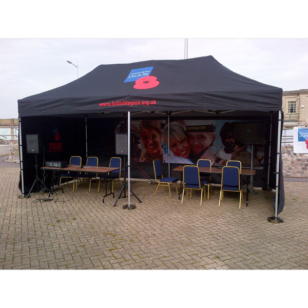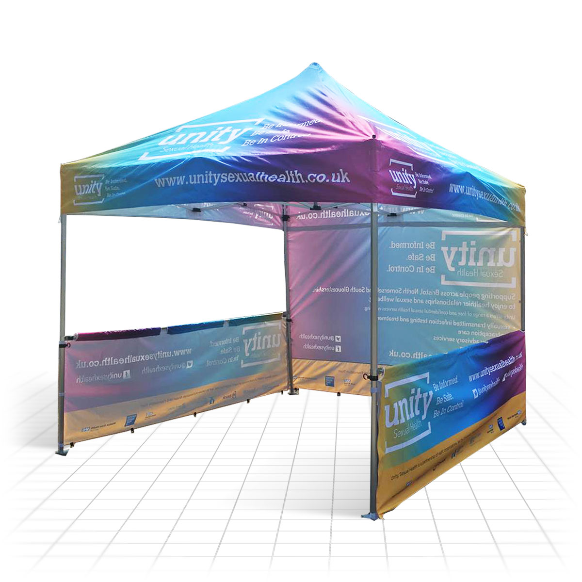 Save time and money with our range of interchangeable Vallance wraps, add your printed message to a quick to assemble wrap around printed graphic to allow your Gazebo to be updated quickly. We also offer stock walls in different colours allowing you to quickly and more cost effectively add sides to your Gazebo. Why not mix and match stock walls with your own printed design on one wall or more for a simple way to personalise a standard Gazebo.