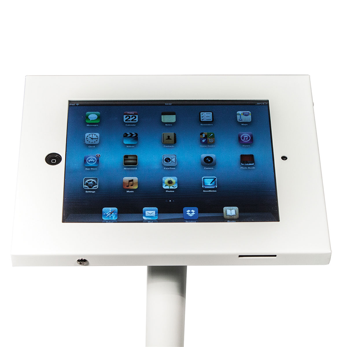 The secure housing comes supplied with security screws, and an Allen key. For extra security the base can be bolted to the floor. Therefore, this iPad display stand is a theft resistant unit, ideal for events, exhibitions and reception areas.