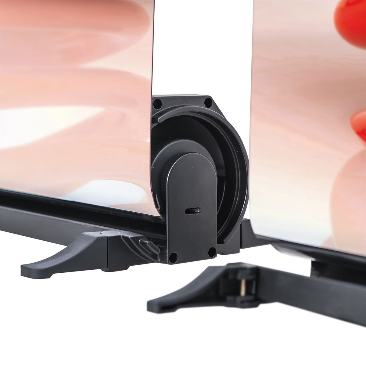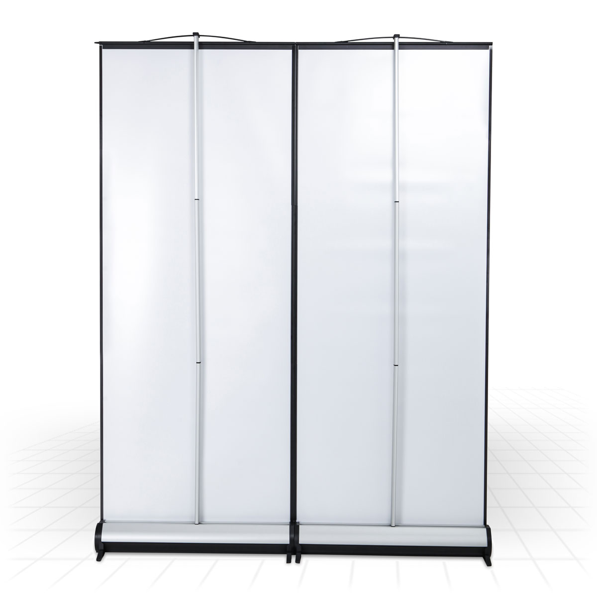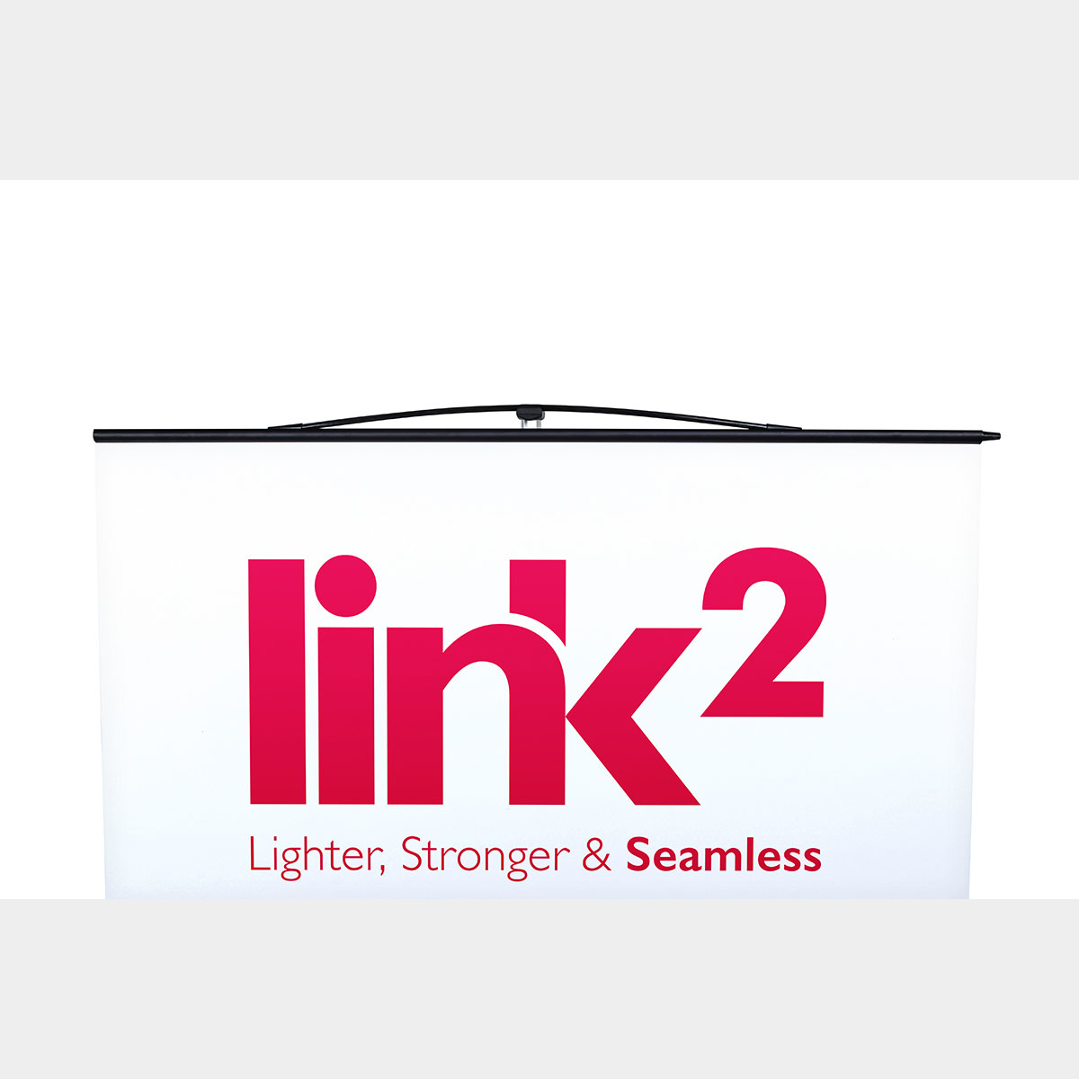 Link banner stands are 85cm wide x 217.5cm high. Multiple Link² display stands can be linked together to create a straight wide backdrop. Or add a 23.5cm flexi link panel to create curves and wave shapes. The patented tension design ensures the graphics are level regardless of the floor it’s on and the base design ensures that graphic panels can be perfectly aligned so that overlapping text and images line up perfectly.