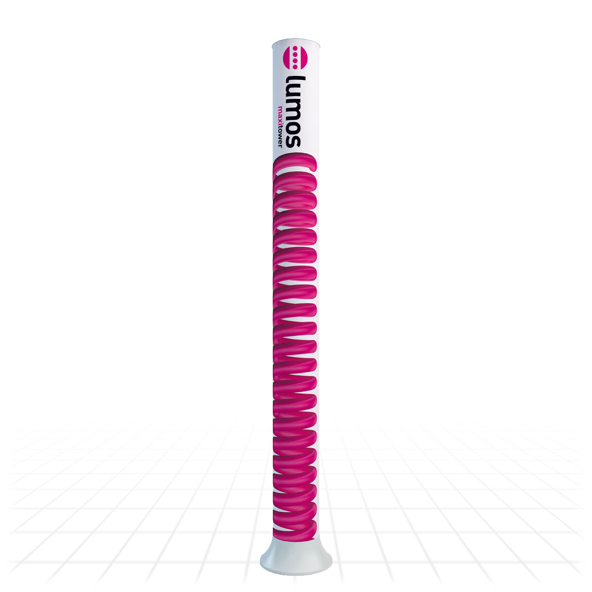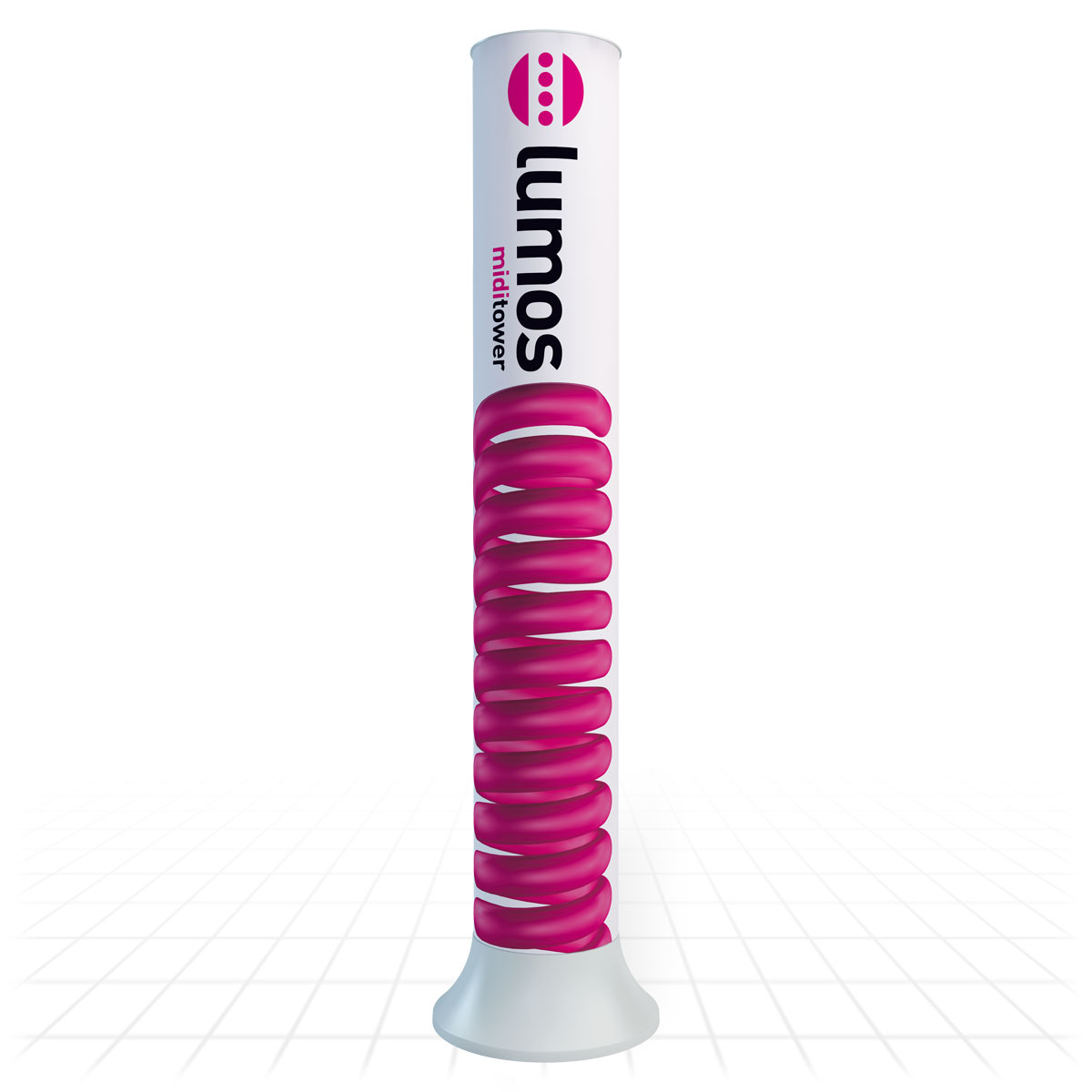 Supplied with RGB LED internally lighting which allows variable lighting colours and sequence colour changes. There is an app available to sync a lighting sequence between multiple Lumos Towers. Each Lumos comes supplied with a mains power lead and also a rechargeable battery for use where there is no power socket nearby.