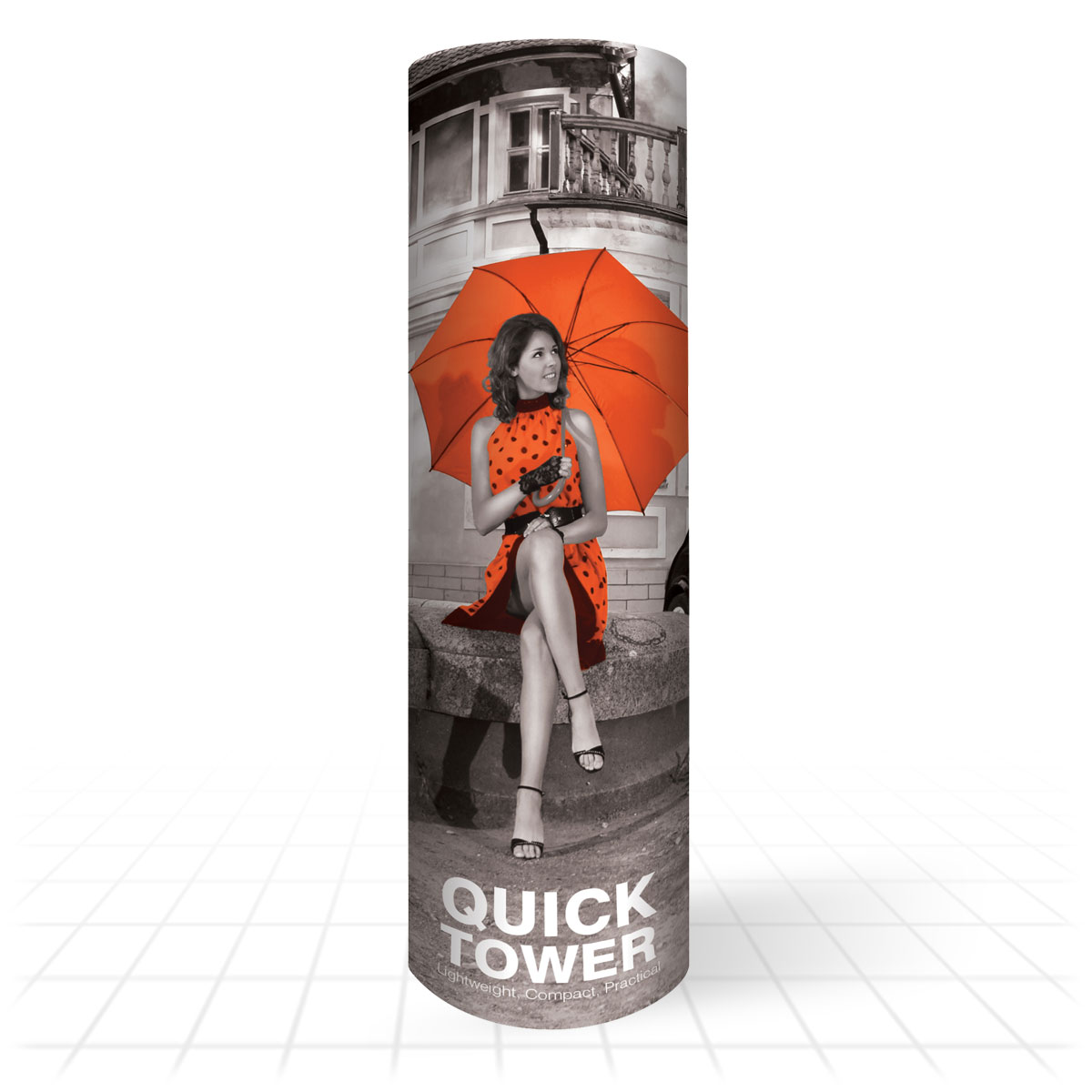 We use the same high impact, premium graphic panels that are used throughout our pop up stand range. This tower display can be supplied with the framework in a carry box with graphic panels in a carry drum, or the complete system and panels can be supplied in a heavy duty wheeled case.