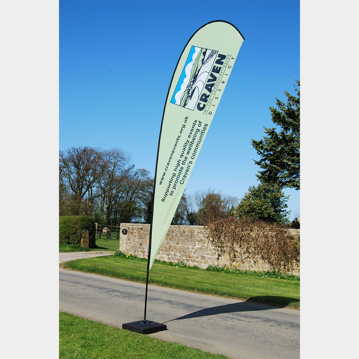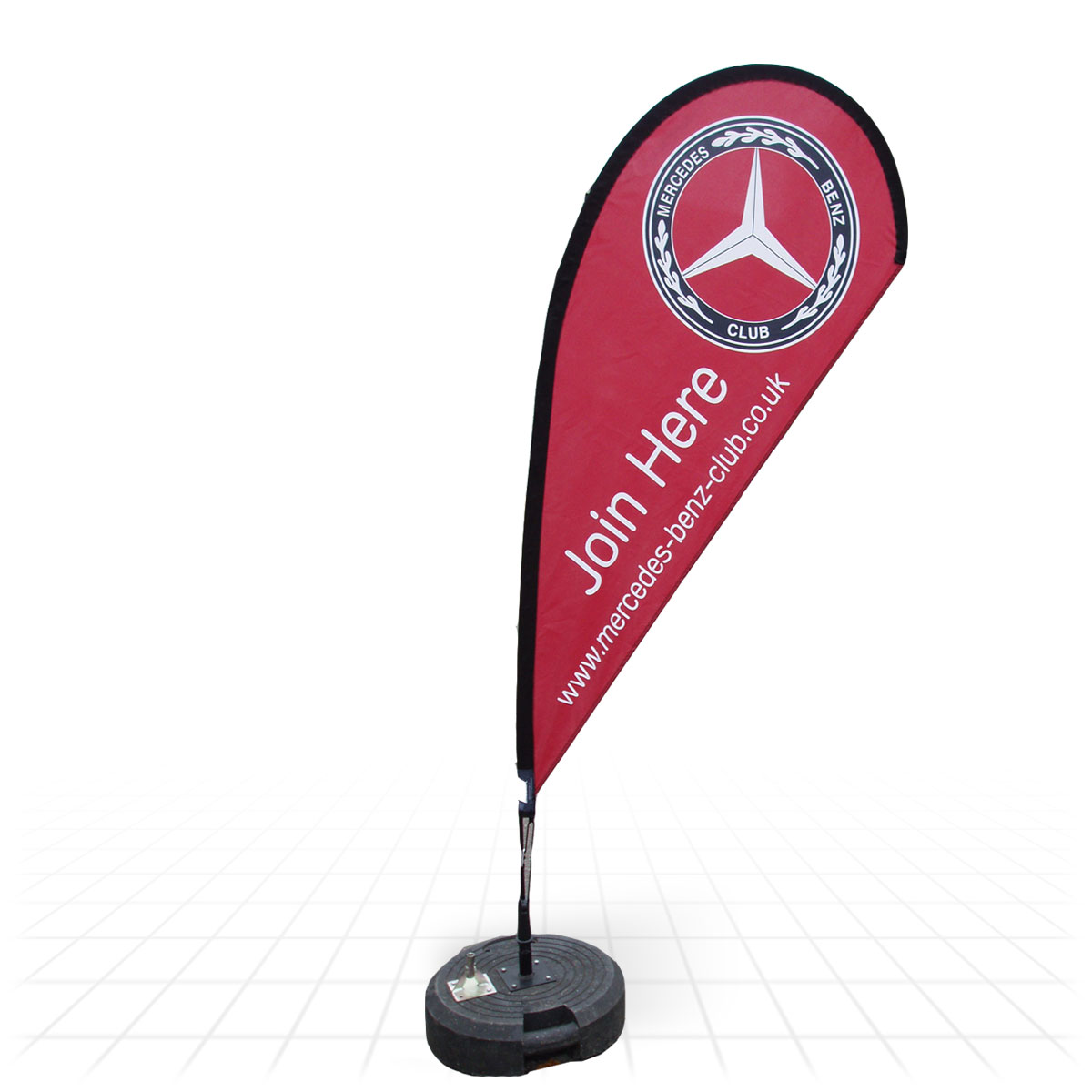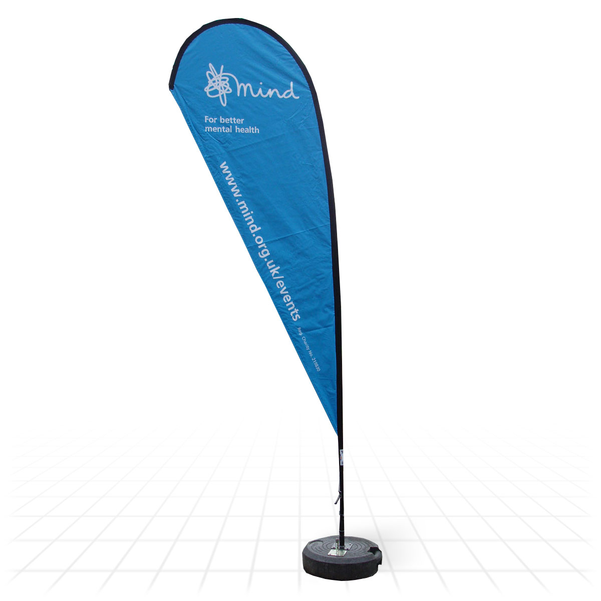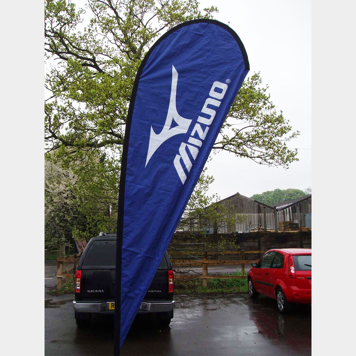 Teardrop Banners are available with a range of bases and fittings including ground spikes, cross bases with water bags, car wheel mounts and wall mounts.