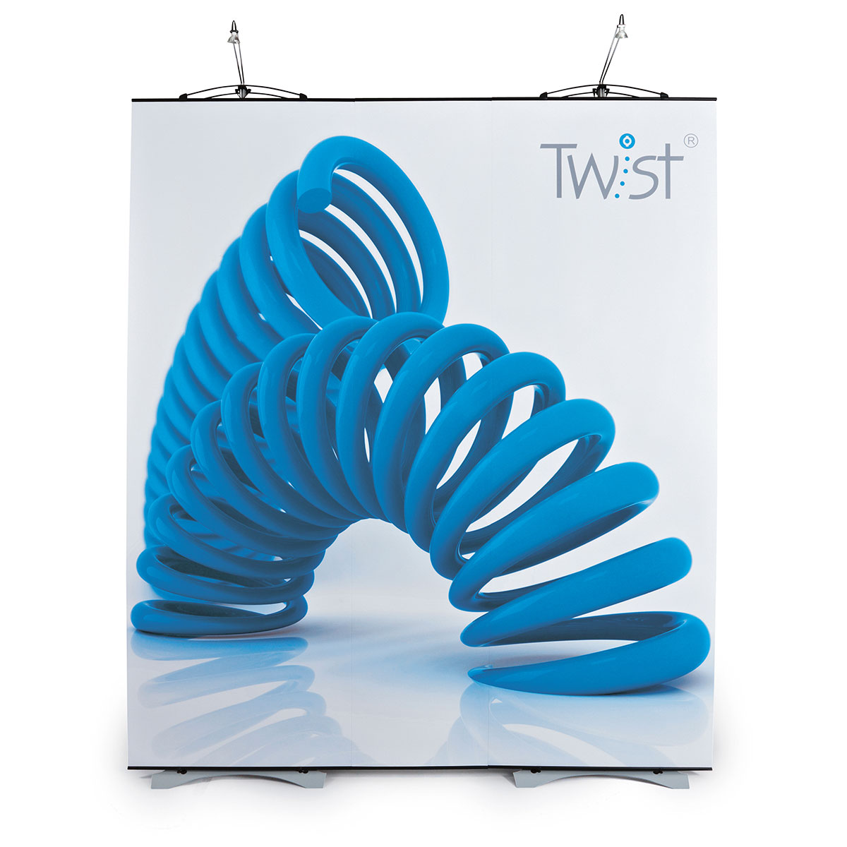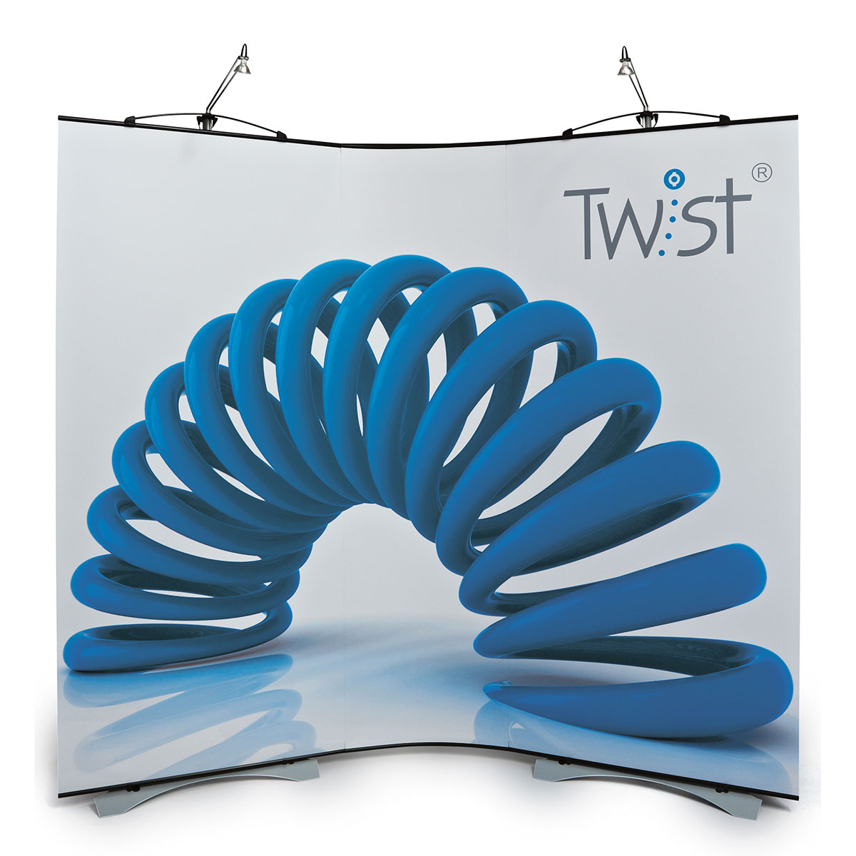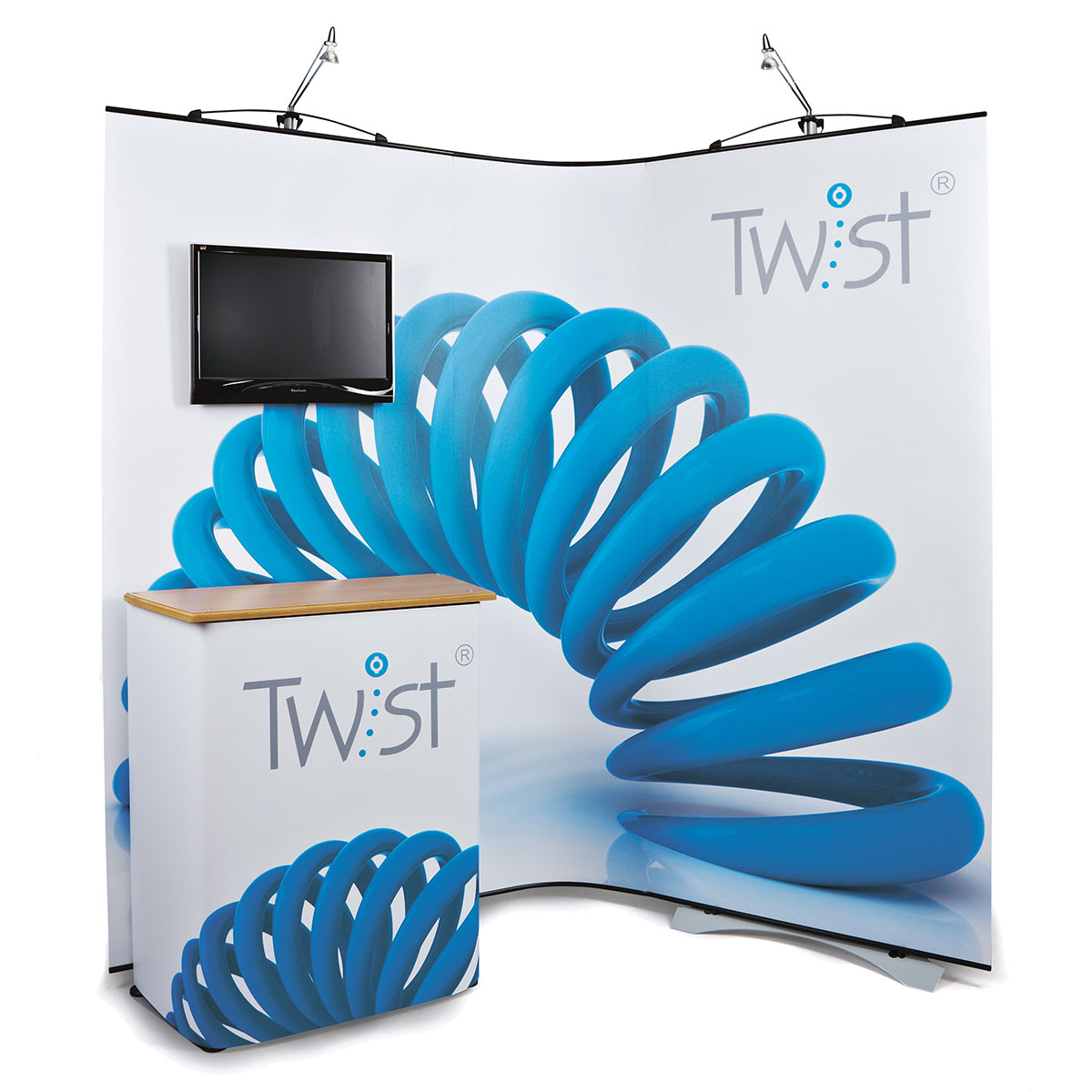 Twist Banner Stands are a new unique display stand which bridge the gap between banner stands and Pop Up exhibition display stands. Twist offers a flexibility that traditional Pop Up stands aren’t able to offer. Twist banner display stands can be used as individual banner displays, and then be seamlessly joined together to create a large exhibition stand with a bespoke shape. Unique stands and structures can be created with a wide range of accessories including LCD screens, literature display and product display.