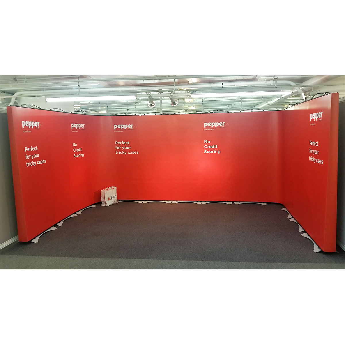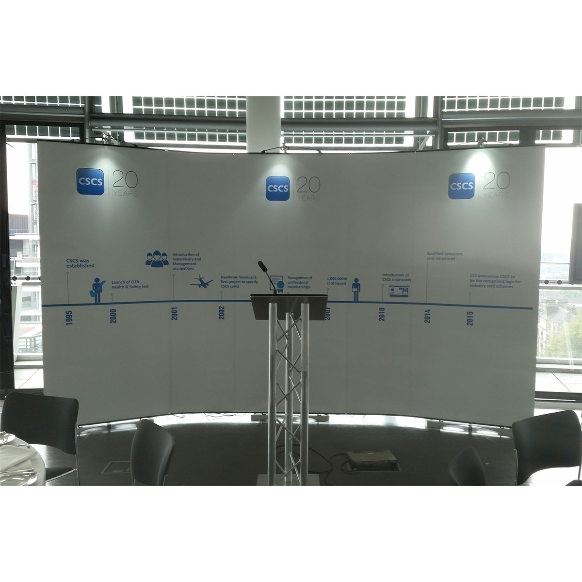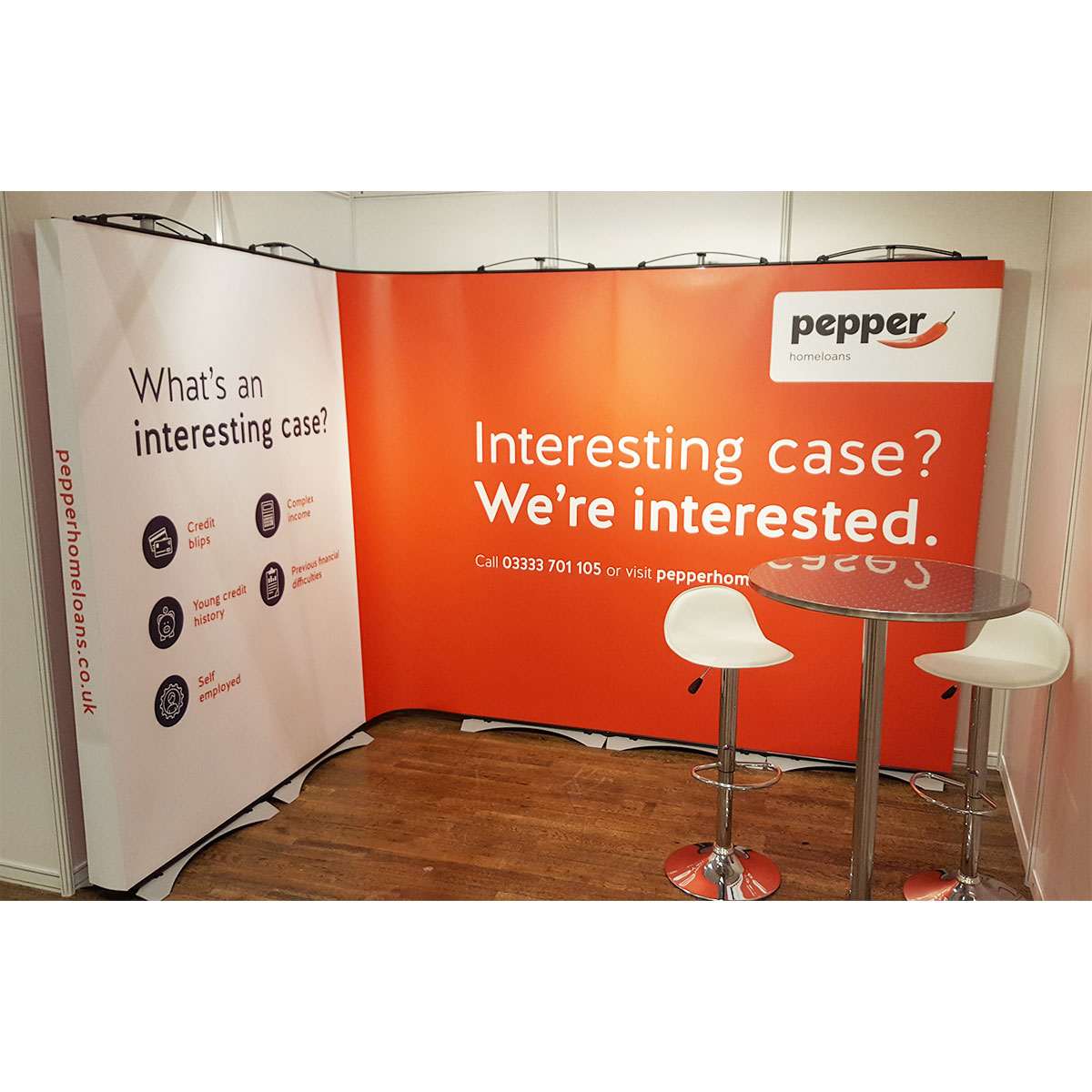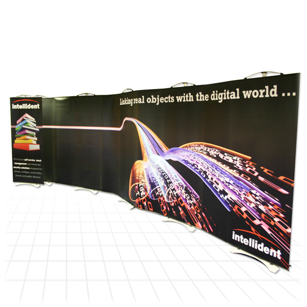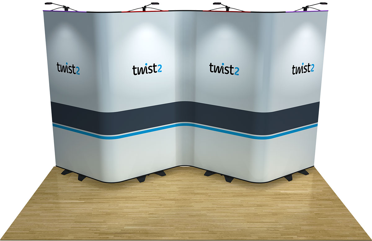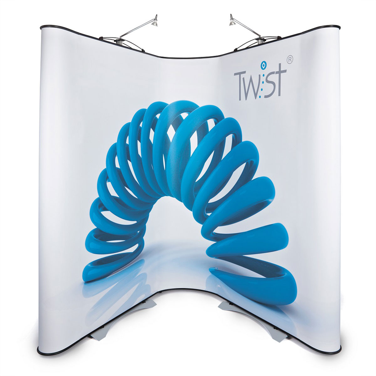 Twist stands can be seamlessly linked together with the 55cm wide patented Flexi-Link graphic panel. The flexible fitting enables Twist stands to be linked together at almost any angle, producing unique exhibition stands. Create sweeping curves at any angle you require with the Flexi-Link panel. Flexi Link curves give the ultimate in flexible display stands, ensuring that your stand will be able to cope with any unexpected obstacles.