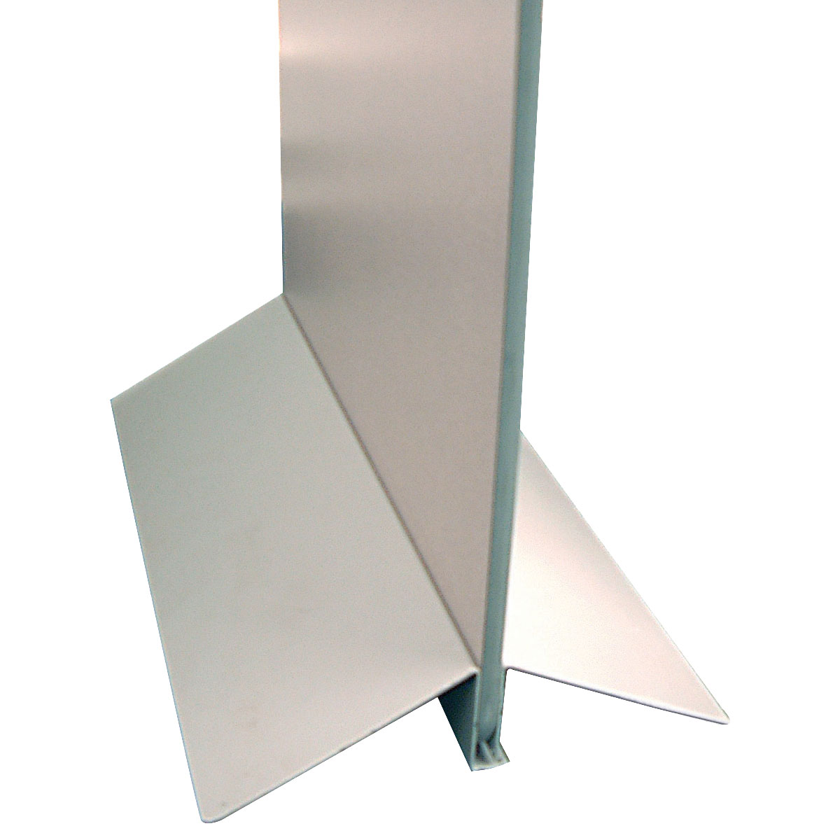 The Wedge display unit is an steel base which holds rigid printed graphic panels in place. The sleek, grey powdercoated base can clamp any size printed board up to 1m wide.