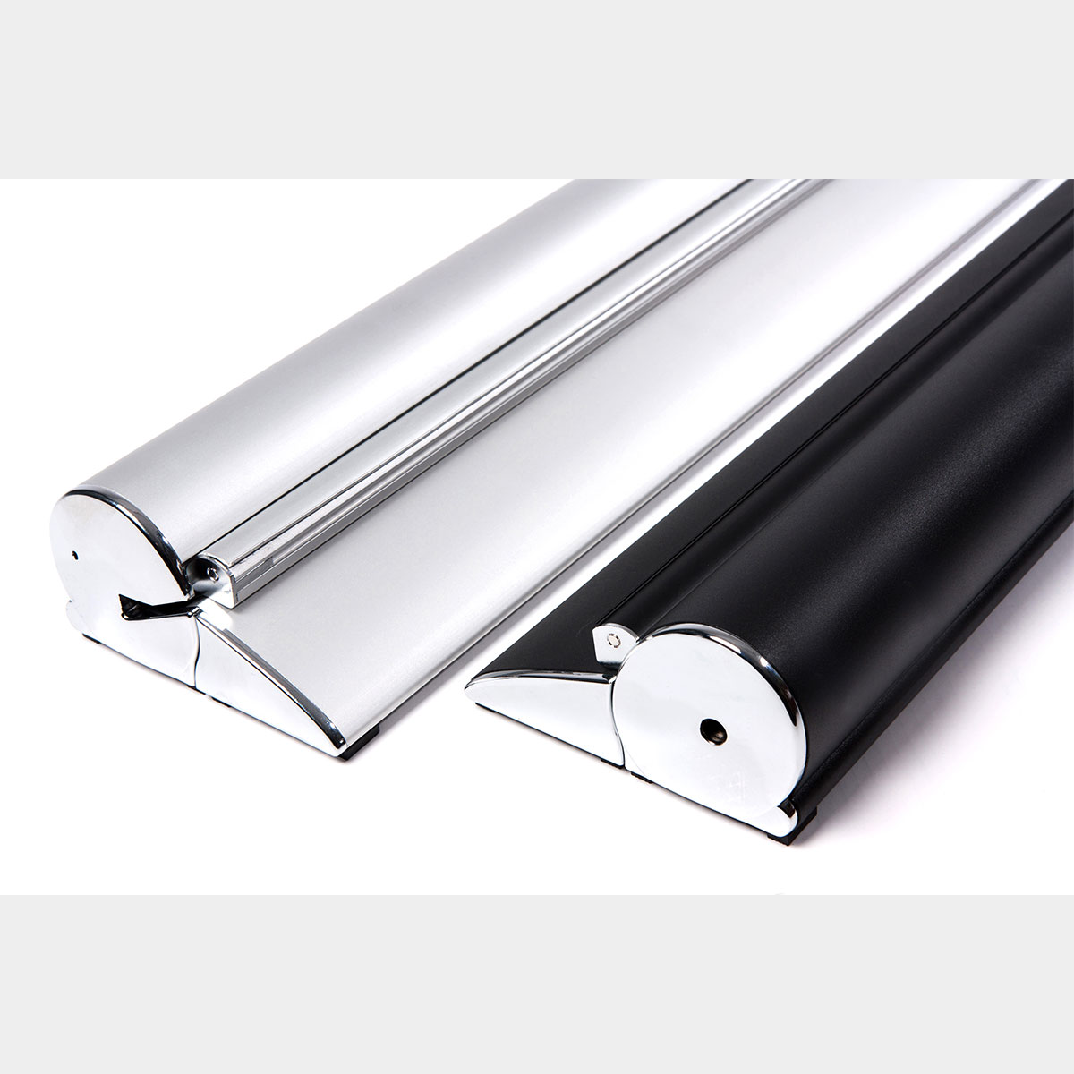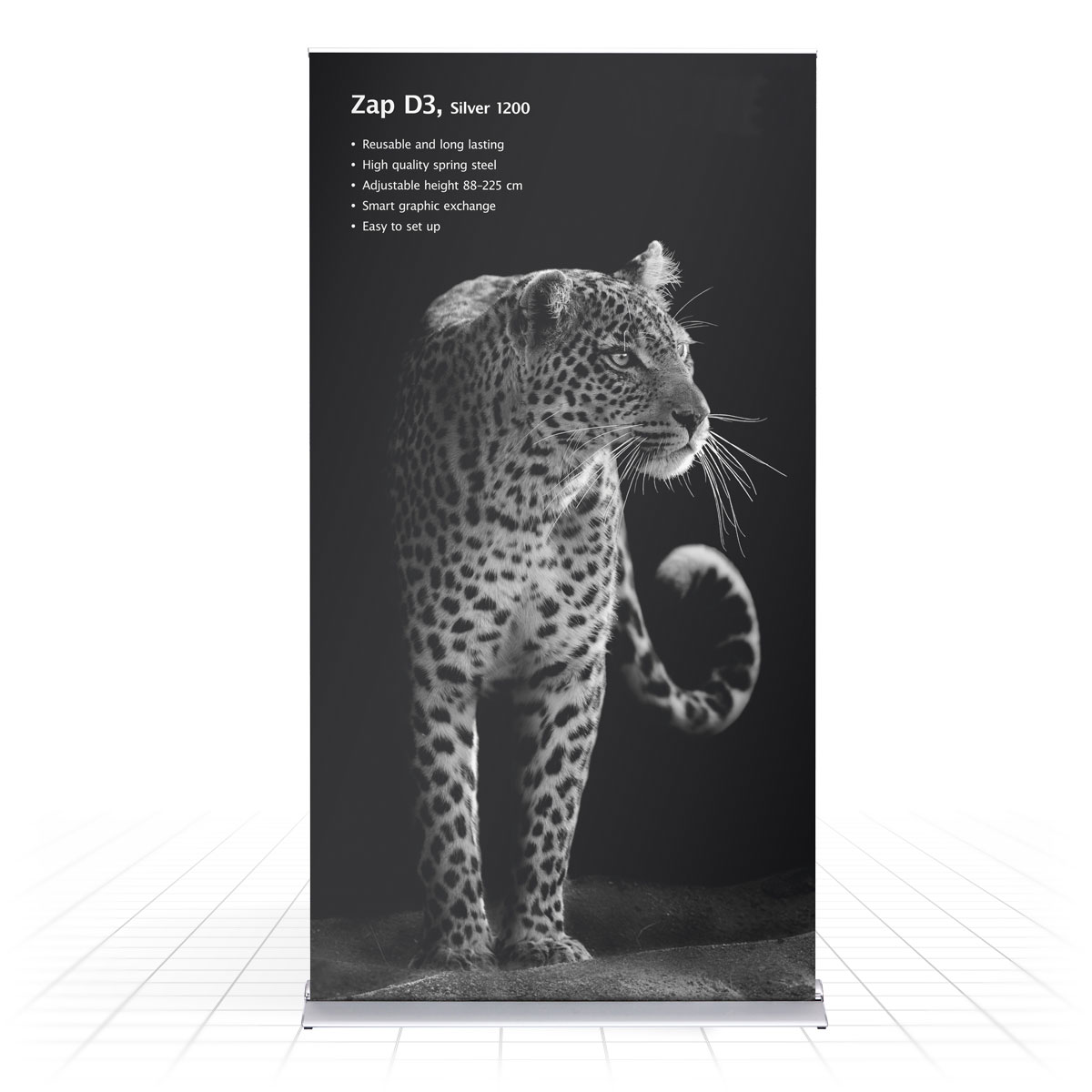 Our Zap banner stands are one of our best selling roller display stands. The Zap D3 has the extra advantage of no no ugly protruding front foot and a modern looking base. Durable and long lasting life span, attractive chrome or black finish and tough build make it suitable for intensive event use.